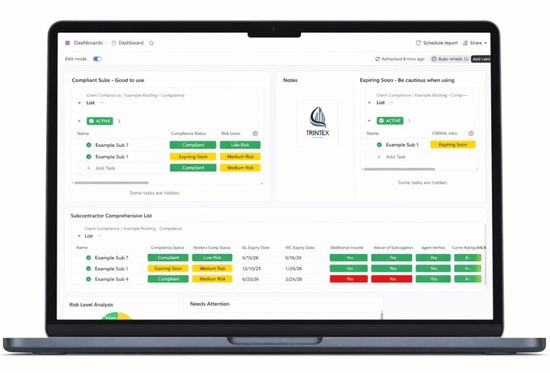 Trintex is a fully managed service. Once you provide us with your subcontractor contacts, we take over everything from there—collecting documents, verifying compliance, tracking expirations, chasing vendors, and flagging any issues that arise. You won’t need to lift a finger. We keep you updated at every step so you always know what’s happening, without having to handle the admin yourself.